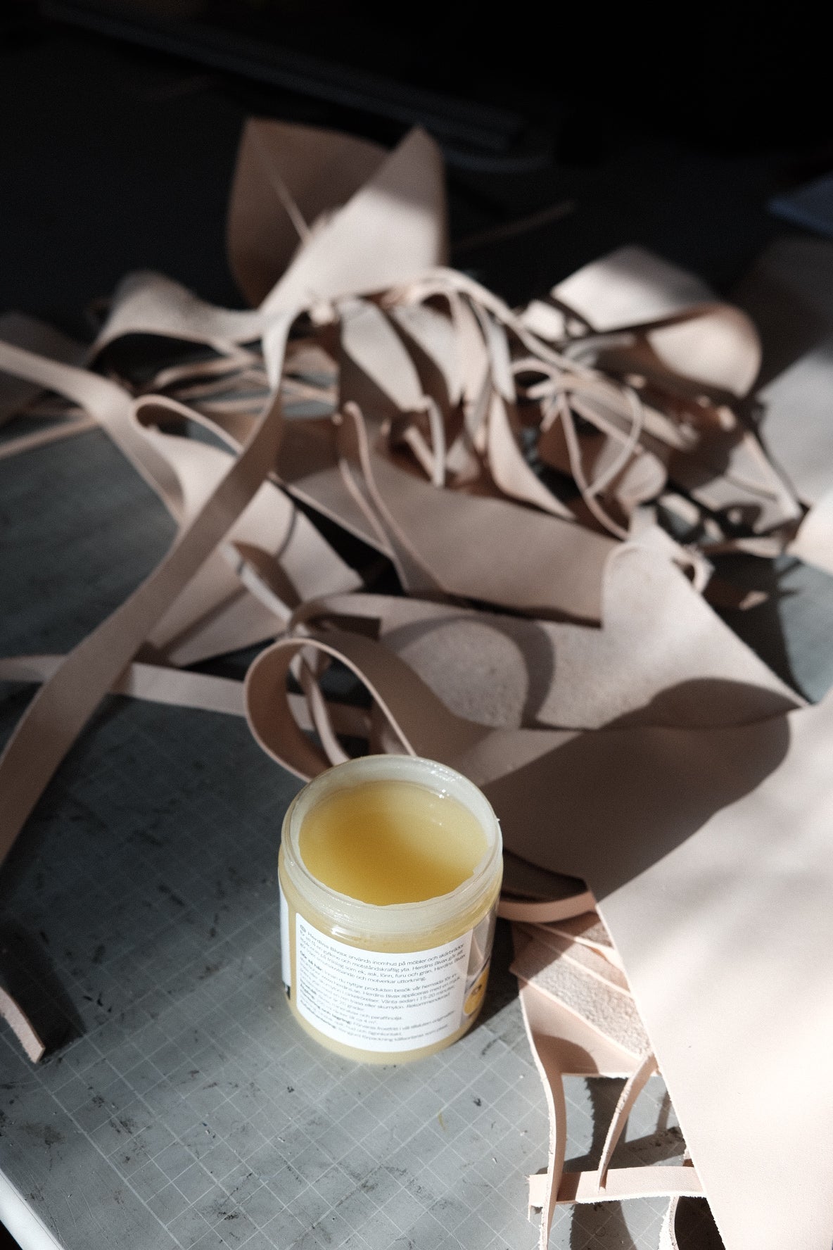 - När lädret känns torrt, applicera ett naturligt läderbalsam (utan starka kemikalier). Smörj in tunt och jämnt.